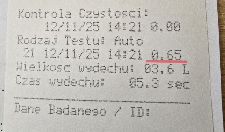 Na miejscu funkcjonariusze wyczuli od sprawcy woń alkoholu. Badanie alkomatem wykazało 0,65 mg/l alkoholu w wydychanym powietrzu, co odpowiada około 1,3 promila. Policyjny system wskazał także, że mężczyzna nie posiada uprawnień do kierowania pojazdami.